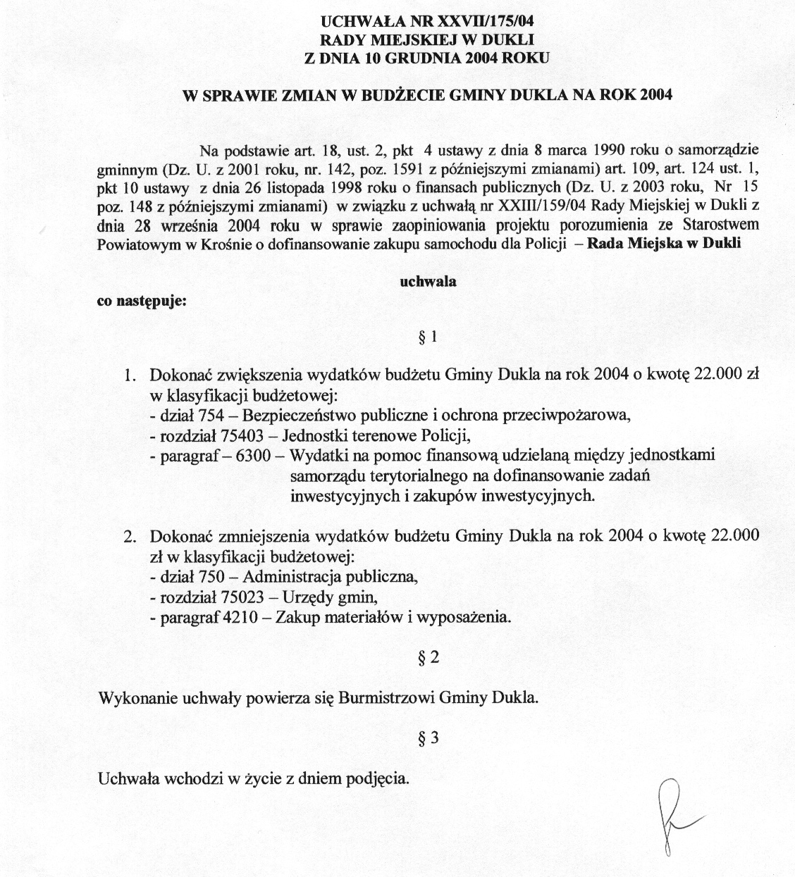 Uchwała Nr XXVII/175/04 w sprawie zmian w budżecie gminy Dukla na rok 2004