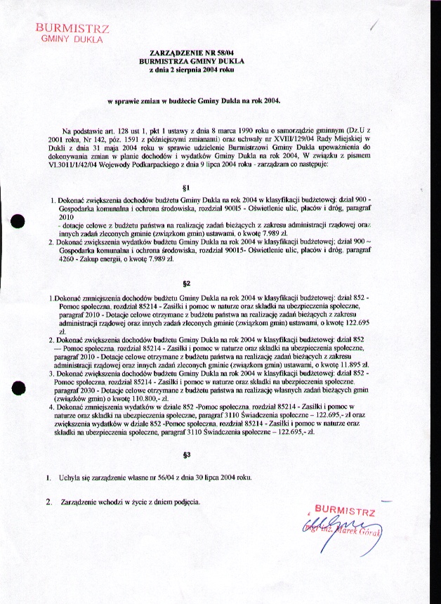 Zarządzenie Nr 58/04 w sprawie zmian w budzecie Gminy Dukla na rok 2004