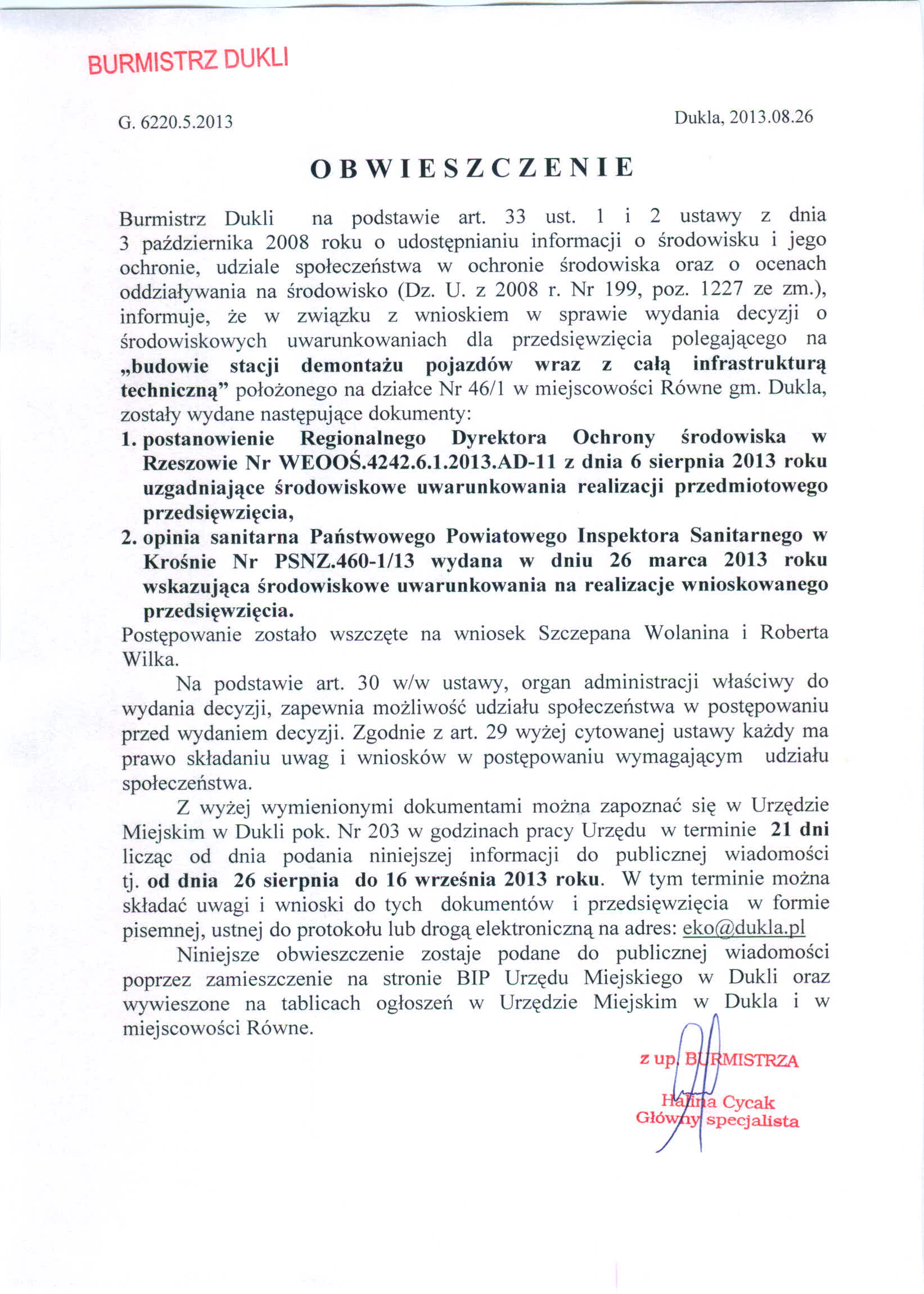 Obwieszczenie o wydaniu dokumentów uzgadniajacych przedsięwzięcie polegajace na "Budowie stacji demontażu pojazdów wraz z cała infrastrukturą techniczną położeonego na działce nr 46/1 w m.Równe".